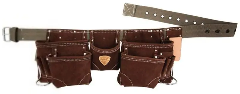This $34 suede apron wins hands-down as our pick for the best tool belt for the money. The DeWalt DG5372 12-pocket Carpenter’s Suede Apron features 5 main pockets. It also gives you 7 small pockets and sleeves to handle pencils, pliers, snips, and similar small items.
