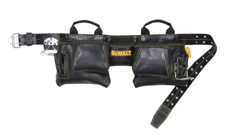 This $34 suede apron wins hands-down as our pick for the best tool belt for the money. The DeWalt DG5372 12-pocket Carpenter’s Suede Apron features 5 main pockets. It also gives you 7 small pockets and sleeves to handle pencils, pliers, snips, and similar small items.